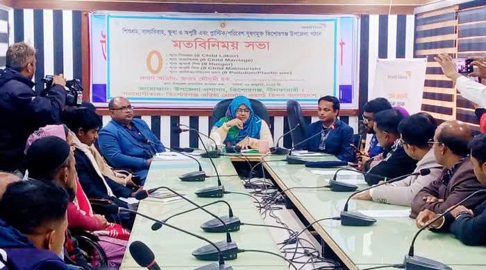 অদ্য ২৯ জানুয়ারি ওয়ার্ল্ড ভিশন বাংলাদেশ কিশোরগঞ্জ এপির সহযোগিতায়,কিশোরগঞ্জ উপজেলা প্রশাসনের আয়োজনে অনুষ্ঠিত হয় 'শিশুশ্রম, বাল্যবিবাহ, ক্ষুধা ও অপুষ্টি এবং প্লাস্টিক/পরিবেশ দূষণমুক্ত কিশোরগঞ্জ উপজেলা গঠনে মতবিনিময় সভা। উক্ত সভায় প্রধান অতিথি হিসেবে উপস্থিত ছিলেন কিশোরগঞ্জ উপজেলার নির্বাহী অফিসার জনাব মোসুমী হক। ওয়ার্ল্ড ভিশন বাংলাদেশ কিশোরগঞ্জ এপির ম্যানেজার জনাব সাগর ডি কস্তার চমৎকার উপস্থাপনায় ৫টি শুণ্য(শুণ্য শিশুশ্রম,শূণ্য বাল্যবিবাহ,শুণ্য ক্ষুধার্ত শিশু,শুণ্য অপুষ্টি শিশু ও শুণ্য প্লাস্টিক/পরিবেশ দূষণ) নিয়ে টেকসই ও গঠনমূলক বক্তব্য রাখেন ওয়ার্ল্ড ভিশন বাংলাদেশ নীলফামারী এসিও সিনিয়র ম্যানেজার জনাব অনুকূল চন্দ্র বর্মন,উপজেলা স্বাস্থ্য ও পরিবার পরিকল্পনা কর্মকর্তা ডা: নীল রতন দেব, উপজেলা মহিলা বিষয়ক কর্মকর্তা নুরুন্নাহার শাহজাদী, উপজেলা সমাজ সেবা অফিসার মোঃ জাকির হোসেন, উপজেলা মাধ্যমিক শিক্ষা অফিসার আসরাফ-উজ-জামান সরকার, ইসলামিক ফাউণ্ডেশনের ফিল্ড সুপারভাইজার মোঃ হেফাজুল ইসলাম, কিশোরগঞ্জ হোটেল মালিক সমিতির সভাপতি মোঃ মানিক হোসেন, এবং দক্ষিন রাজিব গ্রাম উন্নয়ন কমিটির সভাপতি মোঃ আলতানুর রহমান। উক্ত মতবিনিময় সভায় আরো উপস্থিত ছিলেন, ব্র্যাক এনজিও এরিয়া ম্যানেজার,আরডিআরএস প্রতিনিধি সহ বিভিন্ন এনজিও কর্মকর্তা,এবং বিভিন্ন শিক্ষা প্রতিষ্ঠানের প্রধানগণ।
