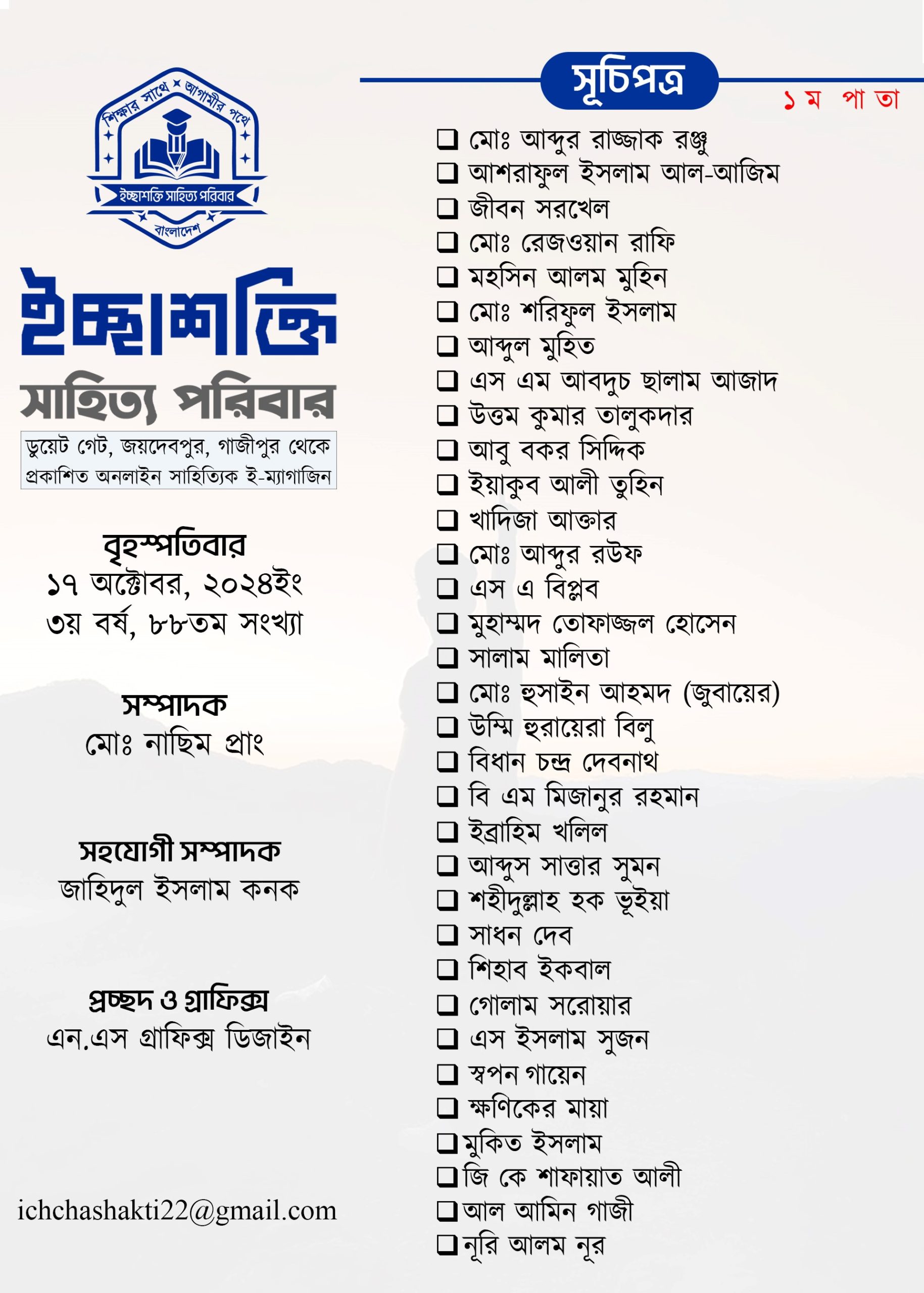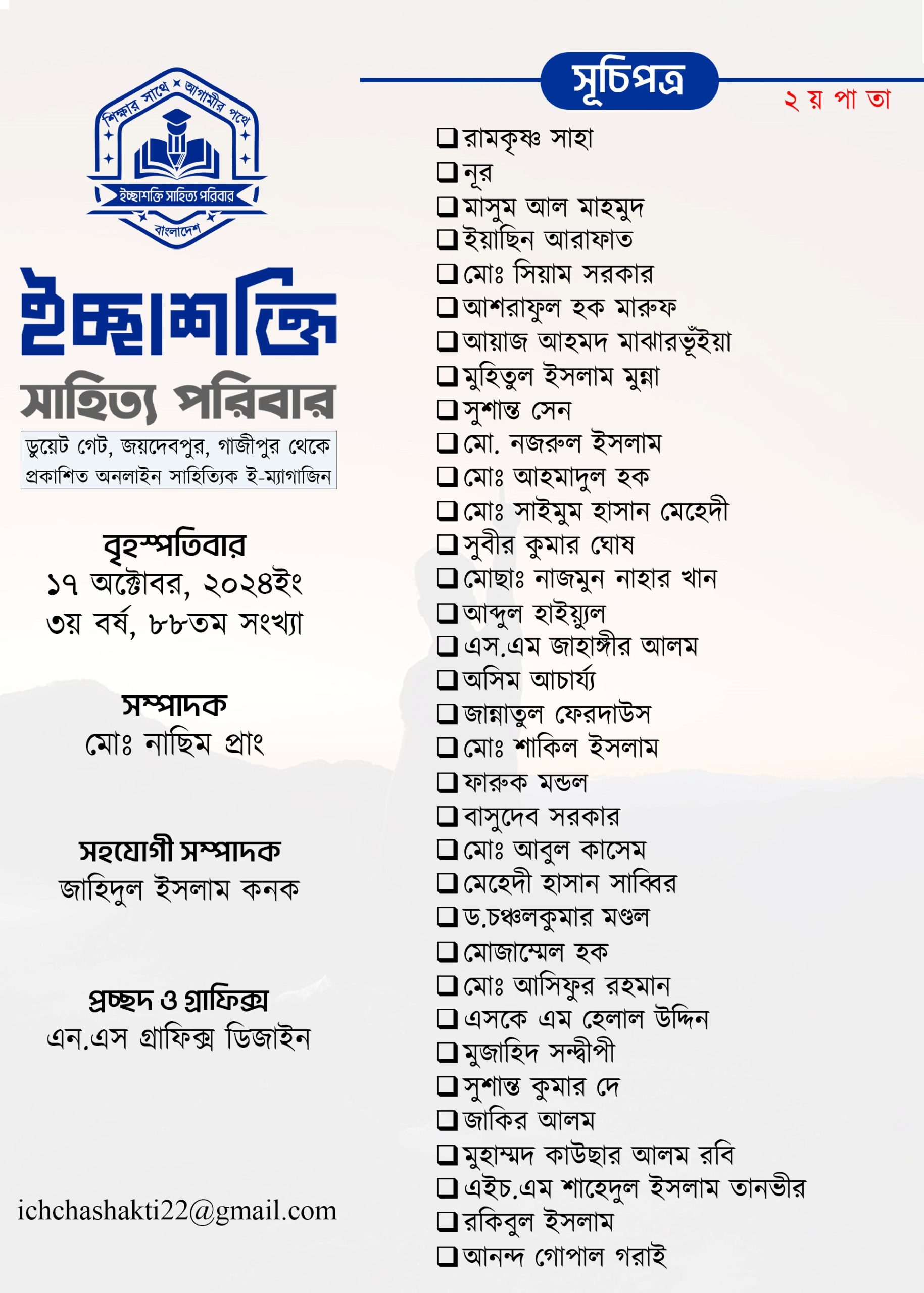 আজ ১৬ সেপ্টেম্বর ২০২৪ং (বুধবার) ইচ্ছাশক্তি সাহিত্য পরিবারের পাক্ষিক অনলাইন ই ম্যাগাজিন ৩য় বর্ষের ৮৮তম সংখ্যার সূচিপত্র প্রকাশ করা হলো- পূর্নাঙ্গ ই পেপার ম্যাগাজিনটি আগামীকাল ১৭ অক্টোবর (বৃহস্পতিবার) প্রকাশিত হবে।