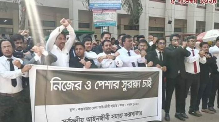 নিজের ও পেশার সুরক্ষার দাবীতে কক্সবাজারে মানববন্ধন ও প্রতীকী হাতকড়া পড়ে অবস্থান কর্মসূচি পালন করেছে আইনজীবীরা।