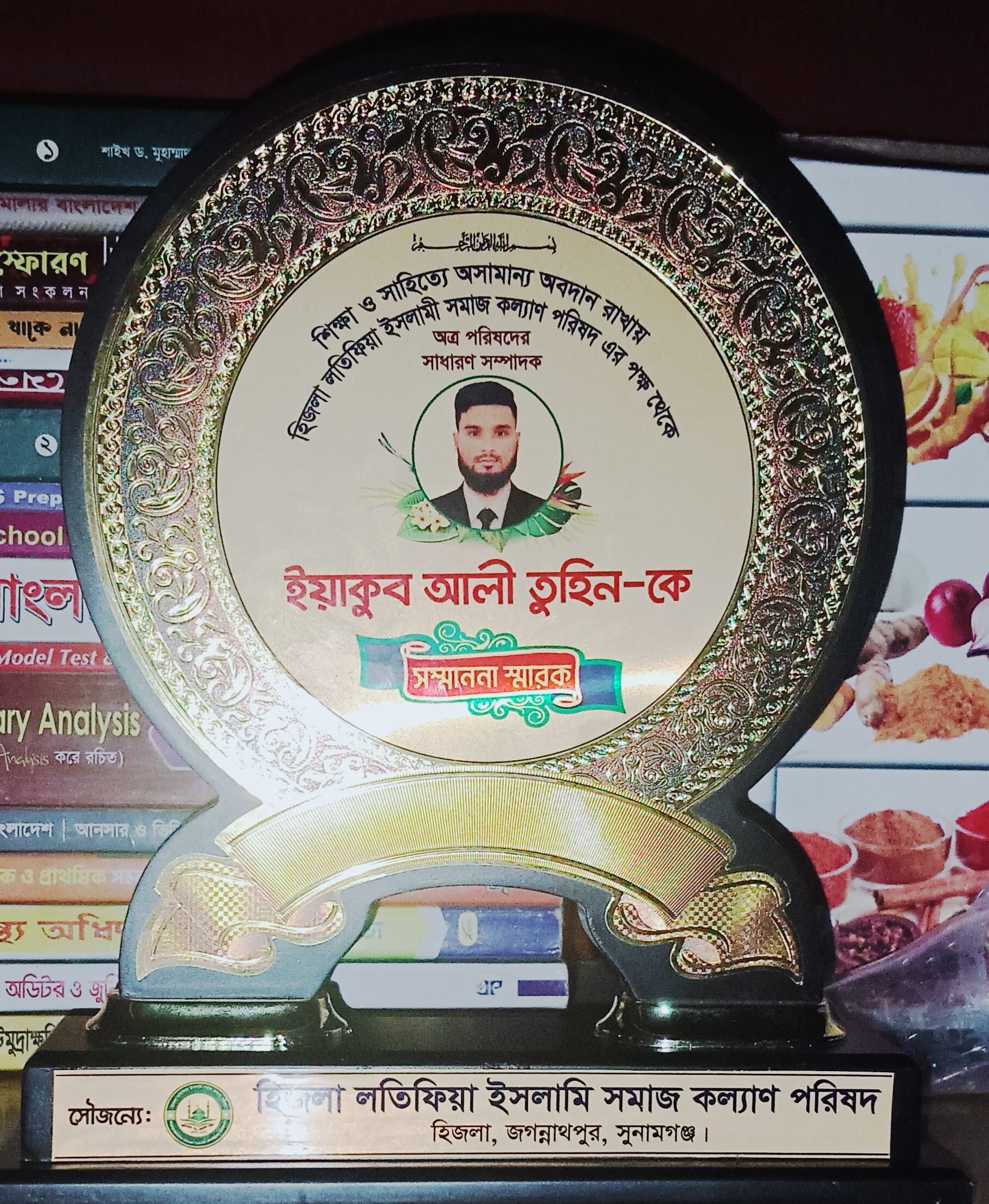 বাংলা সাহিত্যে অসামান্য অবদান রাখার জন্য হিজলা লতিফিয়া ইসলামী সমাজ কল্যাণ পরিষদের পক্ষ থেকে অত্র পরিষদের সাধারণ সম্পাদক, বিশিষ্ট সাহিত্যিক ইয়াকুব আলী তুহিনকে বিশেষ সম্মাননা স্মারক প্রদান করা হয়েছে। উক্ত অনুষ্ঠানে অত্র পরিষদের স্থায়ী কমিটির সদস্য, কার্যকরী পরিষদের সদস্যবৃন্দ উপস্থিত হয়ে এই বিশেষ সম্মাননা স্মারক প্রদানের মাধ্যমে তাঁর সাহিত্যকর্মের প্রতি শ্রদ্ধা জানানো হয়েছে, যা বাংলা সাহিত্য এবং সমাজের জন্য অত্যন্ত গুরুত্বপূর্ণ।