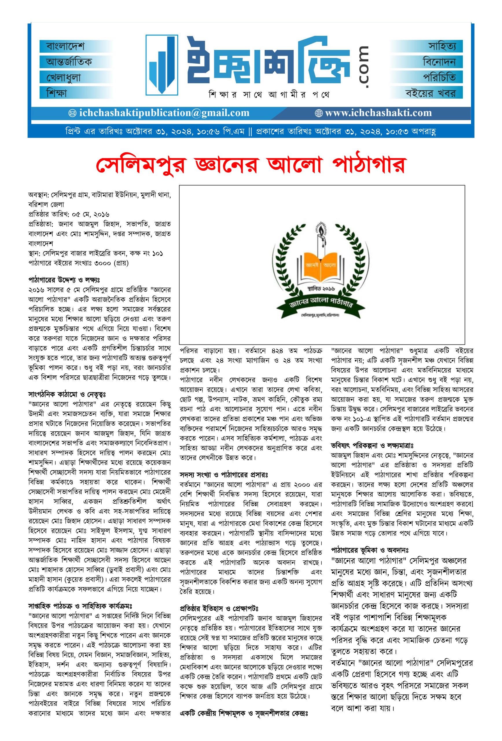 “জ্ঞানের আলো পাঠাগার” শুধুমাত্র একটি বইয়ের পাঠাগার নয়; এটি একটি সৃজনশীল মঞ্চ যেখানে বিভিন্ন বিষয়ের উপর আলোচনা এবং মতবিনিময়ের মাধ্যমে মানুষের চিন্তার বিকাশ ঘটে। এখানে শুধু বই পড়া নয়, বরং আলোচনা, মতবিনিময়, এবং বিভিন্ন সাহিত্য আসরের আয়োজন করা হয়, যা সমাজের তরুণ প্রজন্মকে মুক্ত চিন্তায় উদ্বুদ্ধ করে। সেলিমপুর বাজারের লাইব্রেরি ভবনের কক্ষ নং ১০১-এ স্থাপিত এই পাঠাগারটি বর্তমান প্রজন্মের জন্য একটি জ্ঞানচর্চার কেন্দ্রস্থল হয়ে উঠেছে।