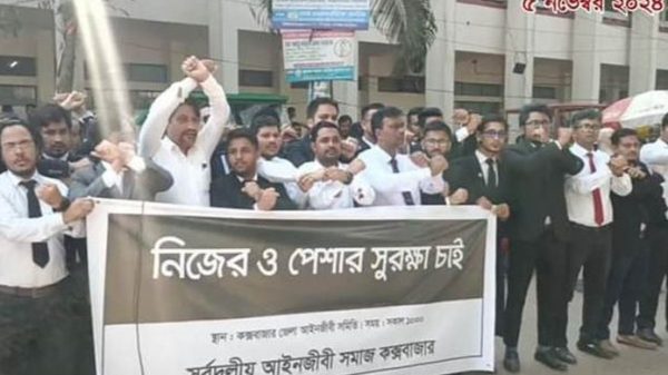 প্রতিনিধিঃ এসএম গোলাম মাওলা রনি, কক্সবাজার। নিজের ও পেশার সুরক্ষার দাবীতে কক্সবাজারে মানববন্ধন ও প্রতীকী হাতকড়া পড়ে অবস্থান কর্মসূচি পালন করেছে আইনজীবীরা। মঙ্গলবার সকাল সাড়ে ১০ টায় কক্সবাজার জেলা আইনজীবী