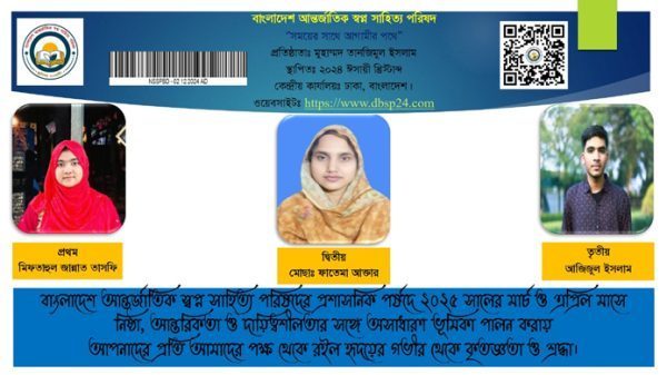 ডেক্সঃ তানজিমুল ইসলাম বাংলাদেশ আন্তর্জাতিক স্বপ্ন সাহিত্য পরিষদ ২০২৫ সালের মার্চ ও এপ্রিল মাসব্যাপী সংগঠনের বিভিন্ন সাহিত্যিক ও সাংগঠনিক কার্যক্রমে নিষ্ঠা, আন্তরিকতা ও দায়িত্বশীলতার অনন্য দৃষ্টান্ত স্থাপনকারী তিনজন এডমিন